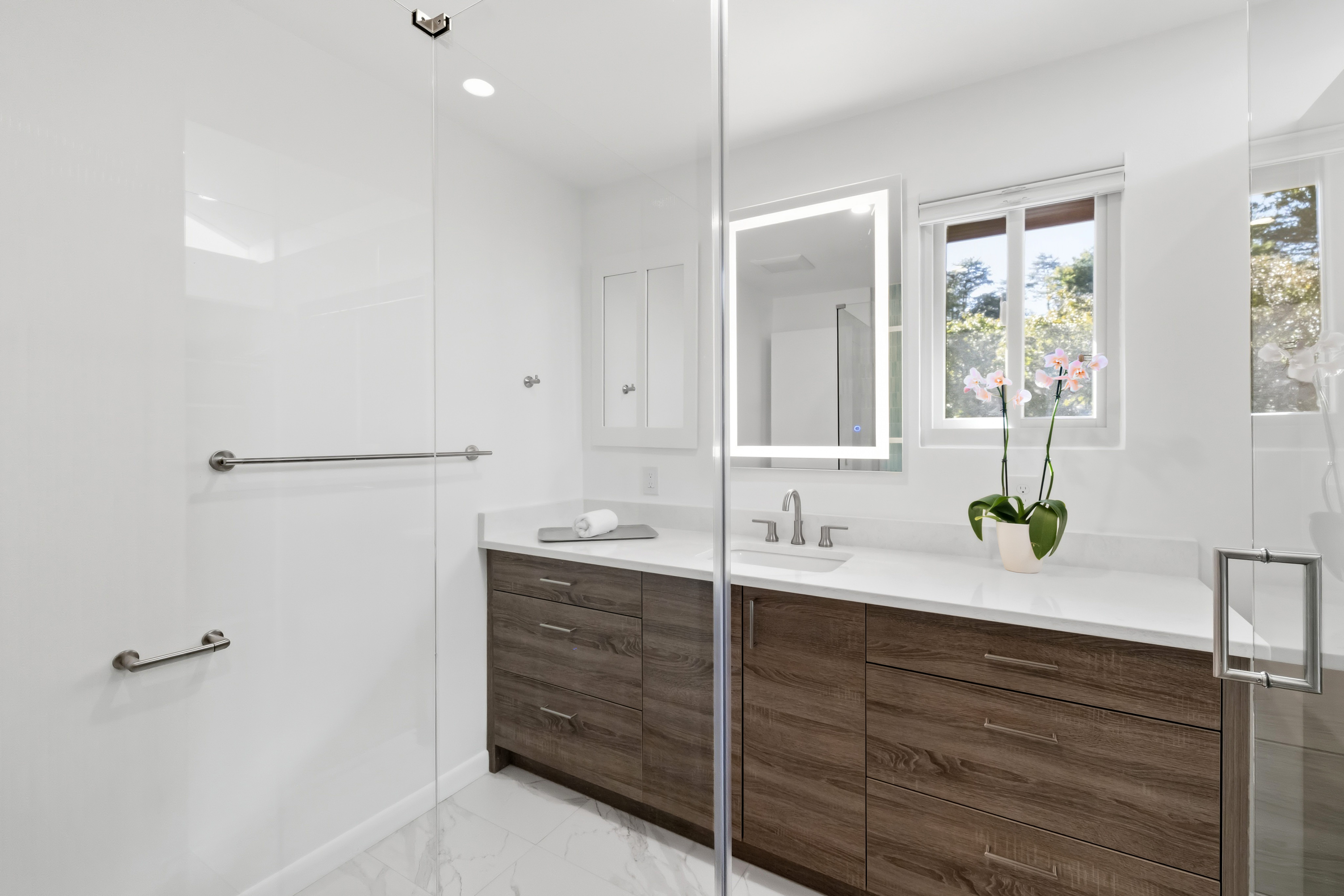This serene primary bath balances natural warmth with modern simplicity. A soft palette of white and wood tones sets a calm, inviting tone, while the light blue vertical tile in the shower introduces subtle texture and color. Clean lines, illuminated mirrors, and brushed nickel fixtures add a contemporary touch without overpowering the tranquil design.