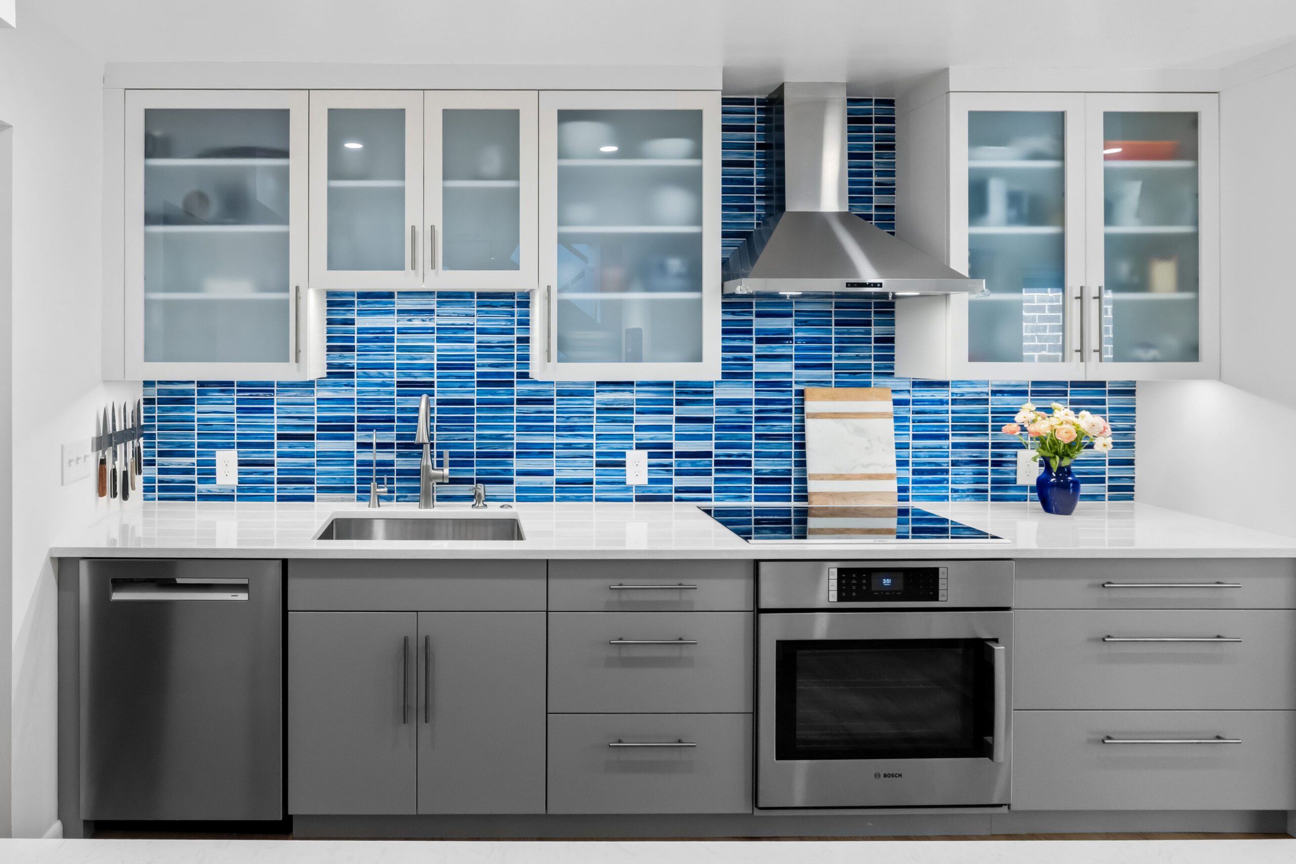 This contemporary kitchen brings a bold splash of personality to a streamlined, functional design. The vibrant blue glass tile backsplash takes center stage, adding depth and movement reminiscent of ocean waves. Paired with sleek gray cabinetry, frosted glass uppers, and crisp white quartz countertops, the space feels both modern and inviting.