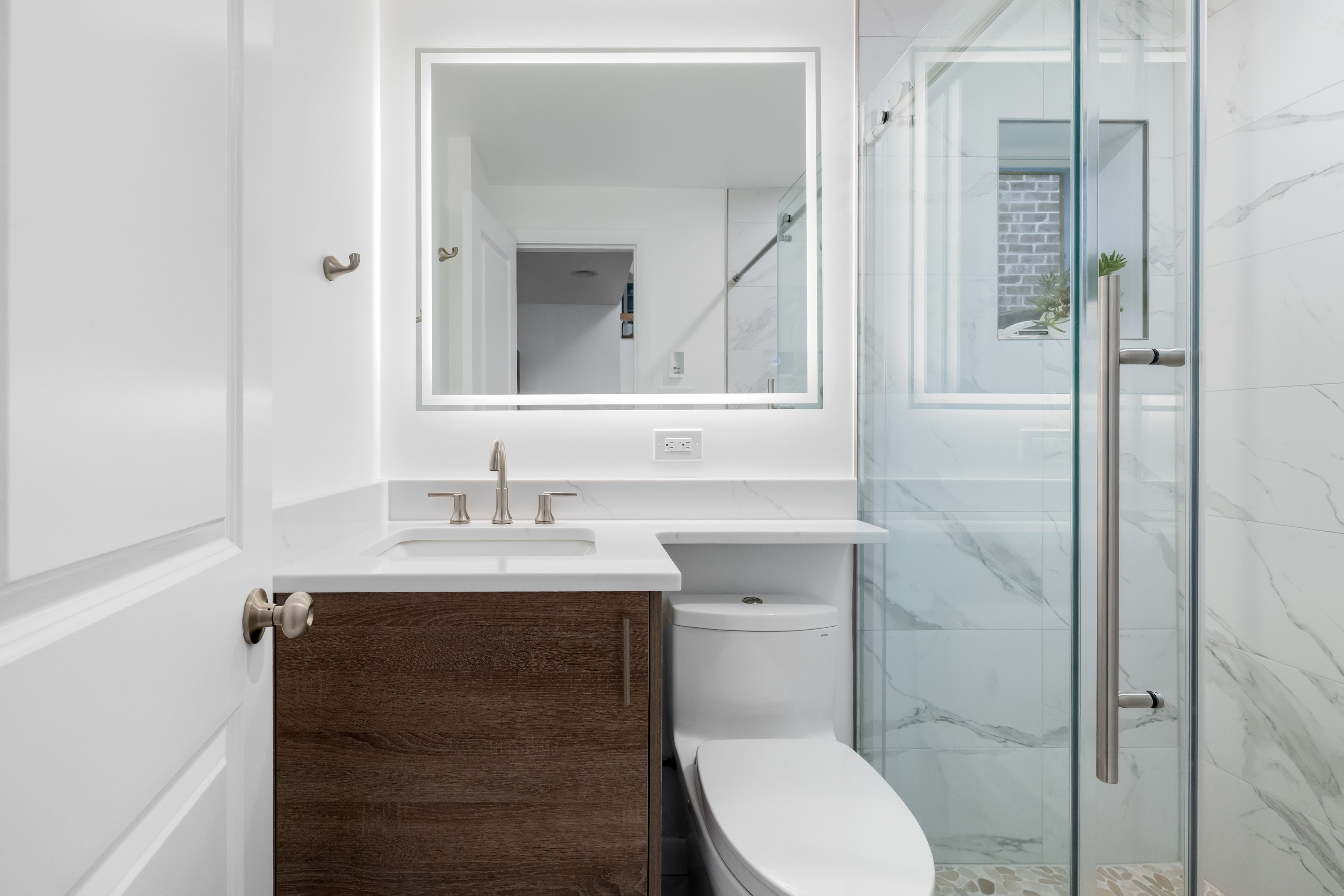 This modern bath blends natural warmth with a clean, contemporary aesthetic. The wood vanity adds texture and contrast against the bright white finishes, while brushed brass fixtures bring a touch of sophistication. A backlit mirror enhances the light and creates a polished, inviting atmosphere – a perfect balance of style and simplicity.